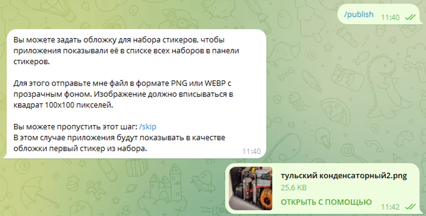 После можно добавить обложку для набора – это изображение в форматах .png или .webp и соотношением сторон 100 на 100 пикселей.