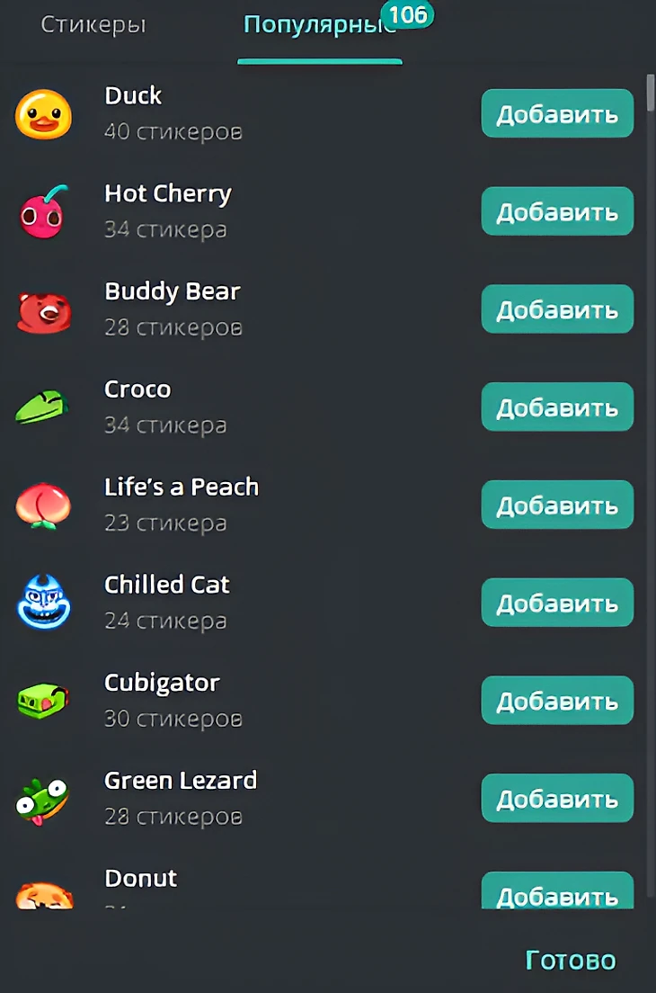 Ниже вы увидите новые наборы стикеров от разработчиков, которые также соответствуют вашему запросу. Просто нажмите «Добавить», чтобы сохранить понравившийся пак.