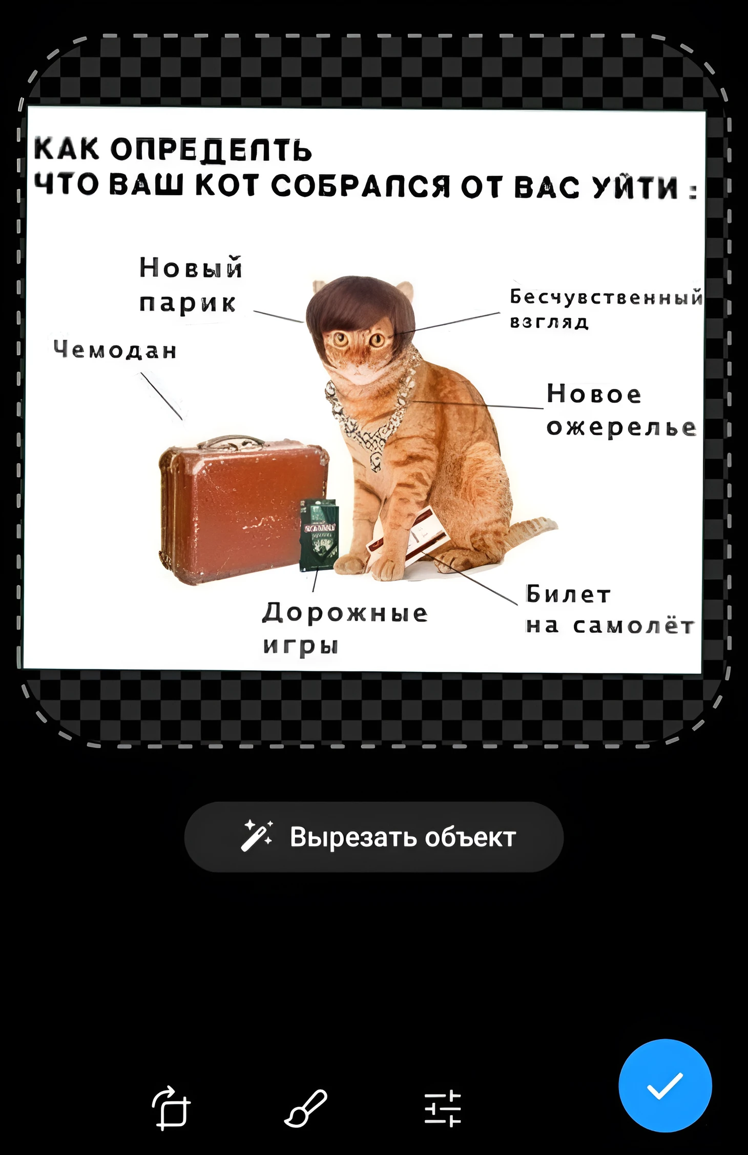 Работает только в мобильном приложении. Этот способ подходит, если вы хотите быстро превратить фото из галереи в стикер и отправить в чат или прикрепить к существующему набору. Но создать полноценный набор с нуля так не получится. Чтобы создать мгновенный стикер: