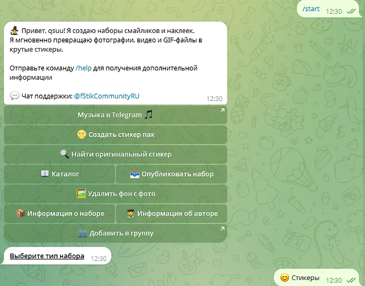 Перейдите, нажмите старт и выберите пункт Создать стикерпак.