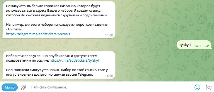 Введите название и короткую ссылку для набора. Если у вас нет идей, как его назвать, то бот предложит сгенерированное название.