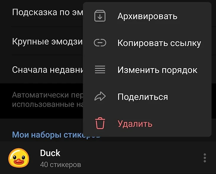Найдите нужный набор в списке ваших стикеров, нажмите на три точки напротив названия набора.