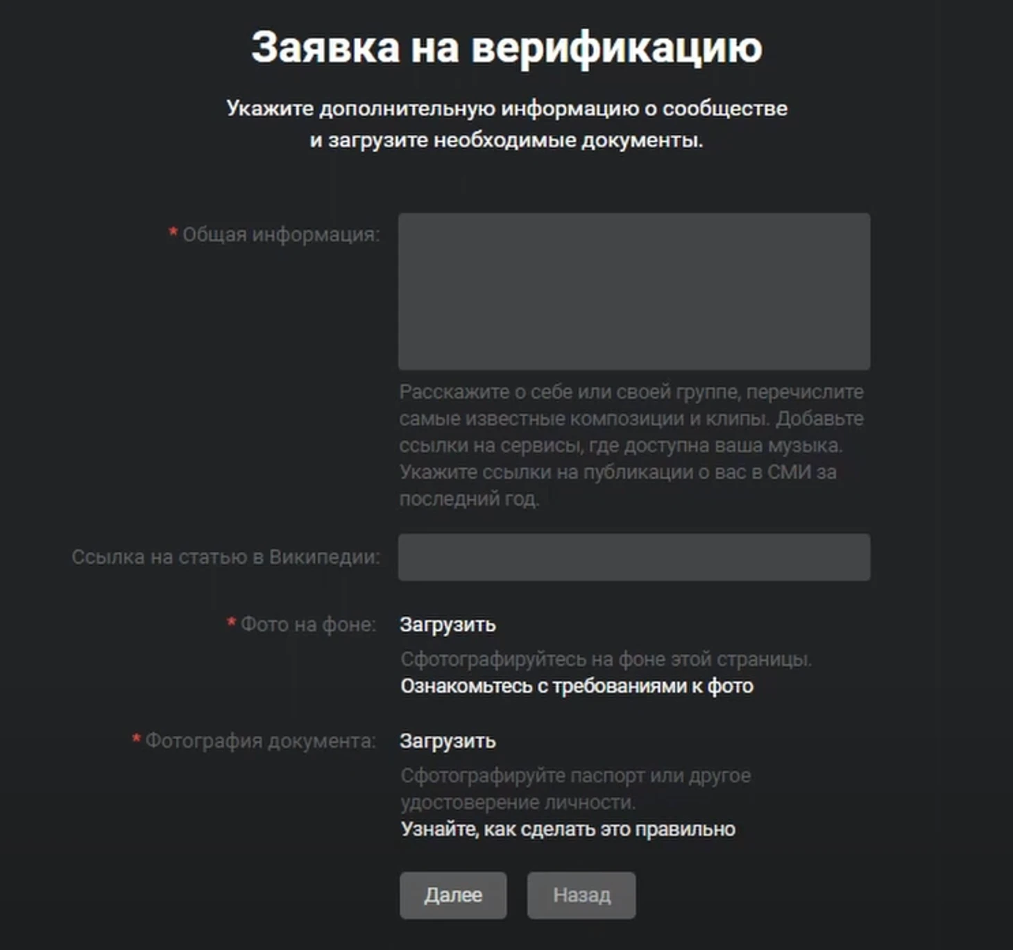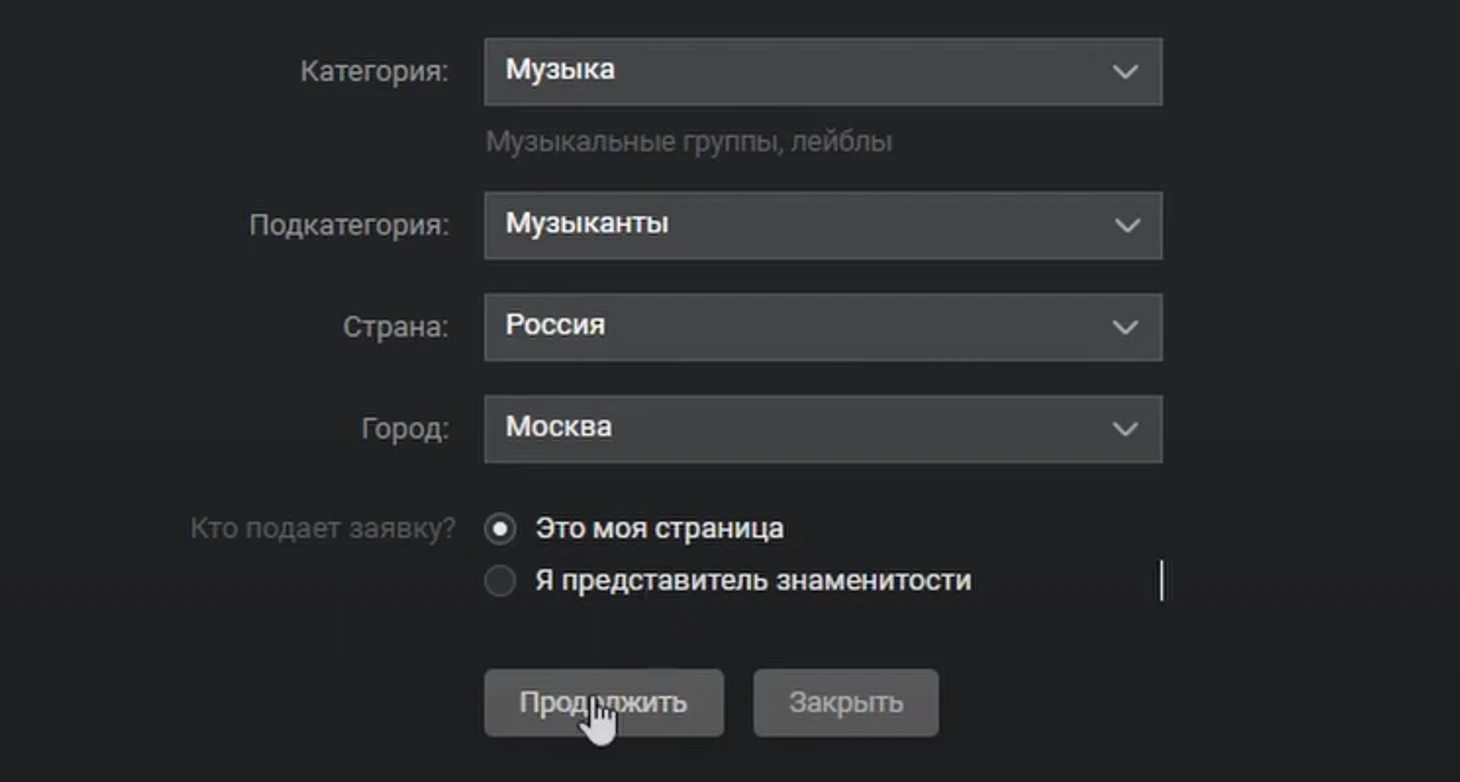 Заполните данные: категория и подкатегория (бизнес, музыка, творчество и т.д.), страна и город, подающий заявку – владелец (музыкант, художник, бизнесмен) или его представитель.