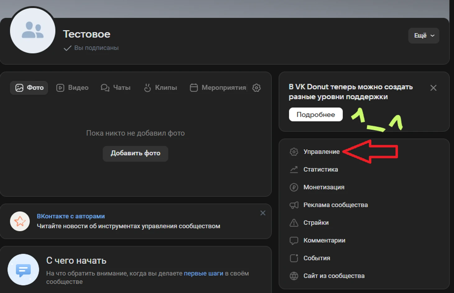 Перейдите в сообщество → Управление.