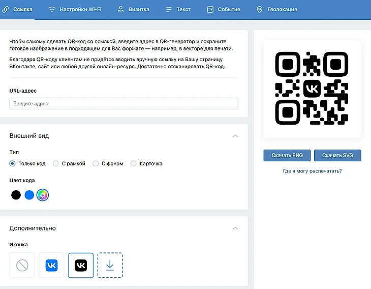 Что можно закодировать: ссылку, текст, настройки Wi-Fi, визитку, событие, геолокацию.
