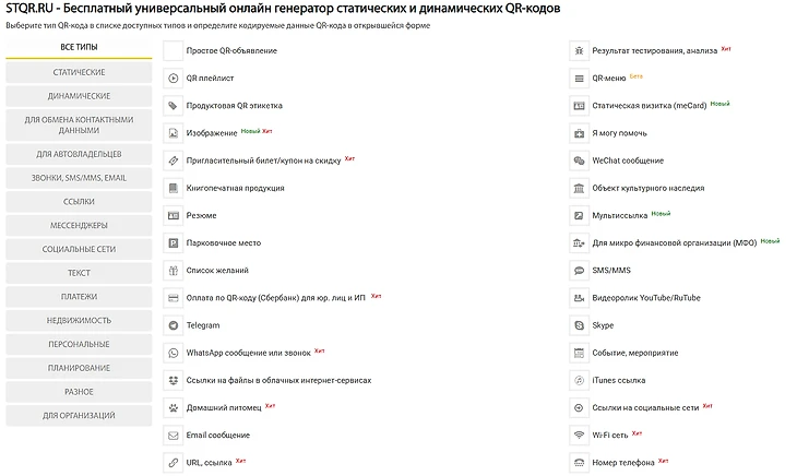 Российский сервис с огромным выбором – 48 типов информации для кодирования, от ссылок до оплаты по QR или вишлистов. Статические коды бесплатны без ограничений, есть продвинутые функции дизайна. Однако обилие возможностей может запутать новичков.