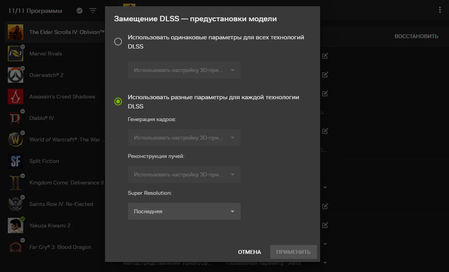 Далее выбираем параметр «Использовать разные параметры для каждой технологии DLSS», в поле Super Resolution выбираем «Последняя» и жмем кнопку подтверждения. После наших манипуляций Oblivion будет использовать улучшенную и более стабильную модель апскейлера DLSS 4.