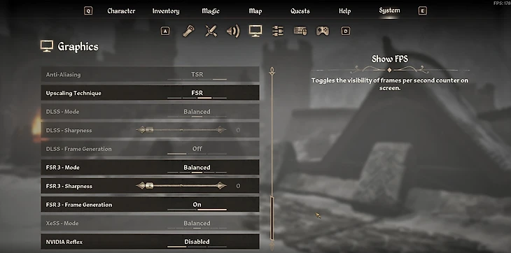 Апскейлеры: используйте DLSS или FSR. Устаревшим моделям видеокарт рекомендуется связка включенных FSR и генератора кадров.