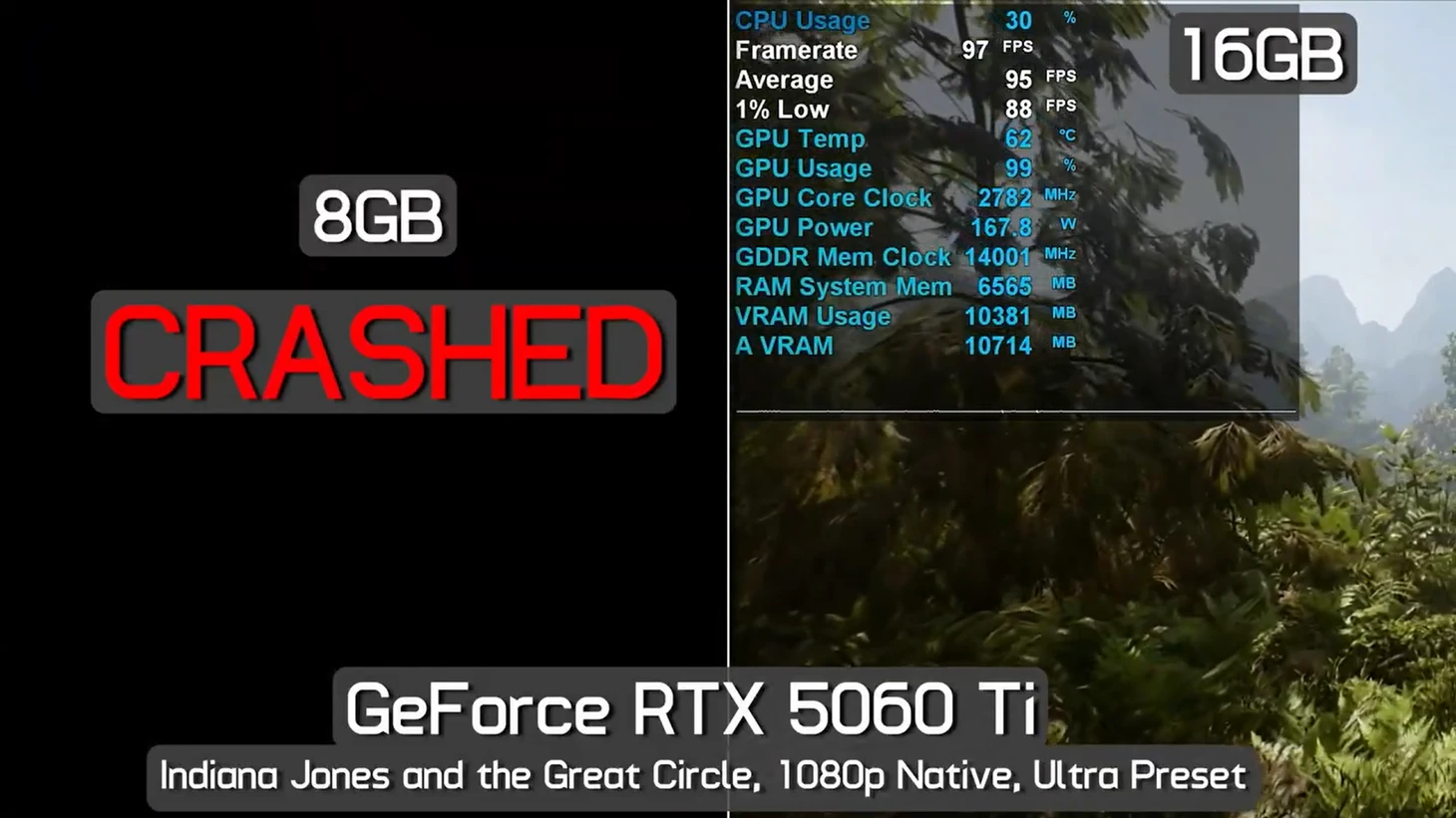 Версию новой видеокарты с памятью вдвое ниже я точно советую всем избегать. Эта модель способна тормозить даже в играх в целевом разрешении 1080p, а в 4K ее не спасают даже навороты DLSS. Это наглядно показали авторы канала Hardware Unboxing, сравнившие лоб в лоб обе модели RTX 5060 Ti.