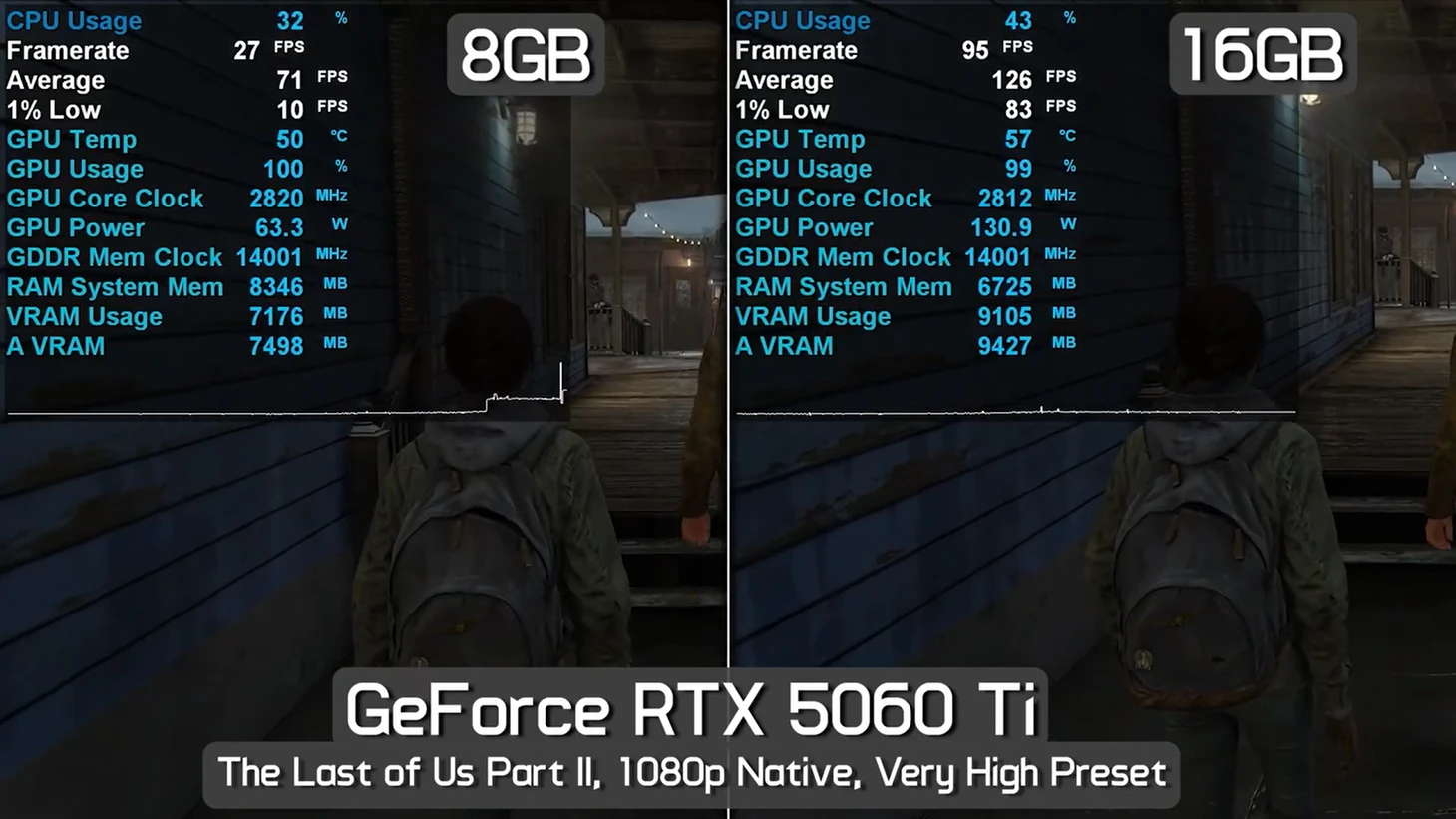 Уже упомянутая The Last of Us Part 2 умудряется резко проседать в спокойных сценах до 10-20 кадров, чего не происходит при игре с видеокартой с 16 ГБ памяти.