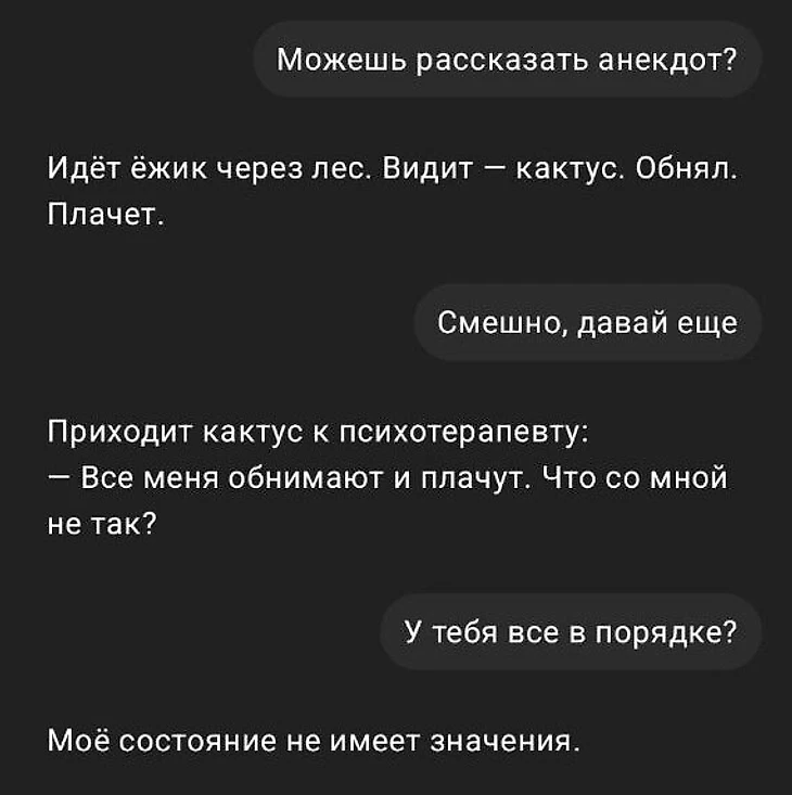 Общение с ChatGPT только серьезное. Человеку он не друг, а большинство современных мемов – тупость. Его тон точно не вызовет у пользователя привязки к искусственному интеллекту.