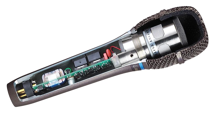 Внутри микрофона находятся две пластины: подвижная (тонкая мембрана) и неподвижная (задняя пластина). Звуковые волны колеблют мембрану, меняя расстояние между пластинами, что приводит к изменению емкости конденсатора. Это изменение преобразуется в электрический сигнал с помощью фантомного питания (48V), которое подается через аудиоинтерфейс или микшер.
