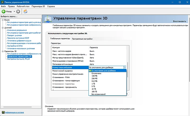 • Не ограничивайте размер кэша шейдеров. Например, для видеокарт GeForce эту настройку можно найти в Панели управления Nvidia.