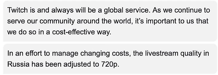 По сути, Twitch заявил: бесплатно обслуживать российских пользователей контентом в 1080р им невыгодно – они теряют деньги на каждой такой трансляции. Ограничение качества – способ уменьшить издержки.