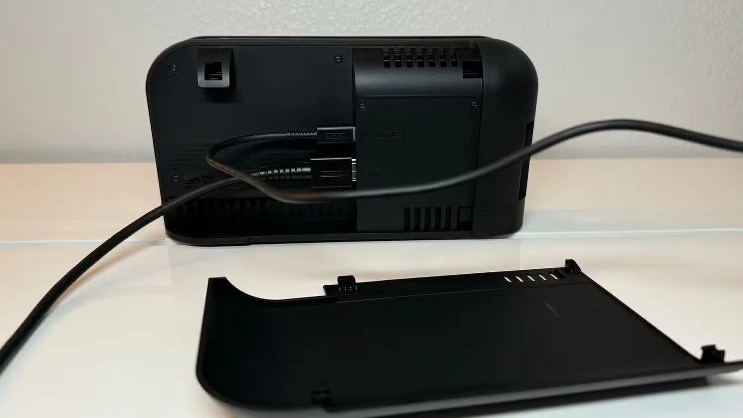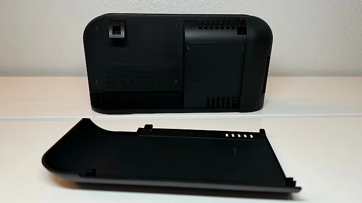 Перед подключением Нинтендо Свитч 2 необходимо отсоединить джойстики от консоли и вставить их на держатель. После возьмите док-станцию и снимите заднюю крышку.