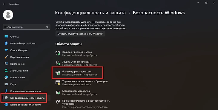 • Нажмите Win + I, перейдите в раздел «Конфиденциальность и защита» –> «Безопасность Windows». Далее выберите «Брандмауэр и защита сети».