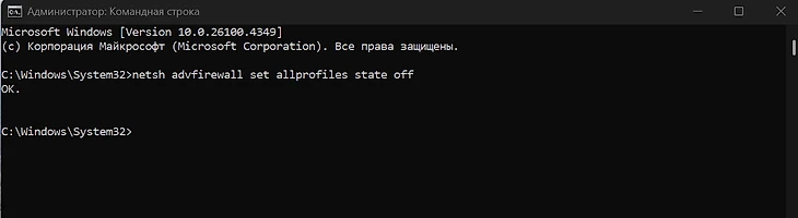 Простой метод без необходимости поиска нужных ползунков. Просто откройте «Пуск» и в поиске введите «Командная строка». Нажмите правой кнопкой на приложение и выберите «Запуск от имени администратора». В открывшемся окне введите команду netsh advfirewall set allprofiles state off и нажмите Enter.