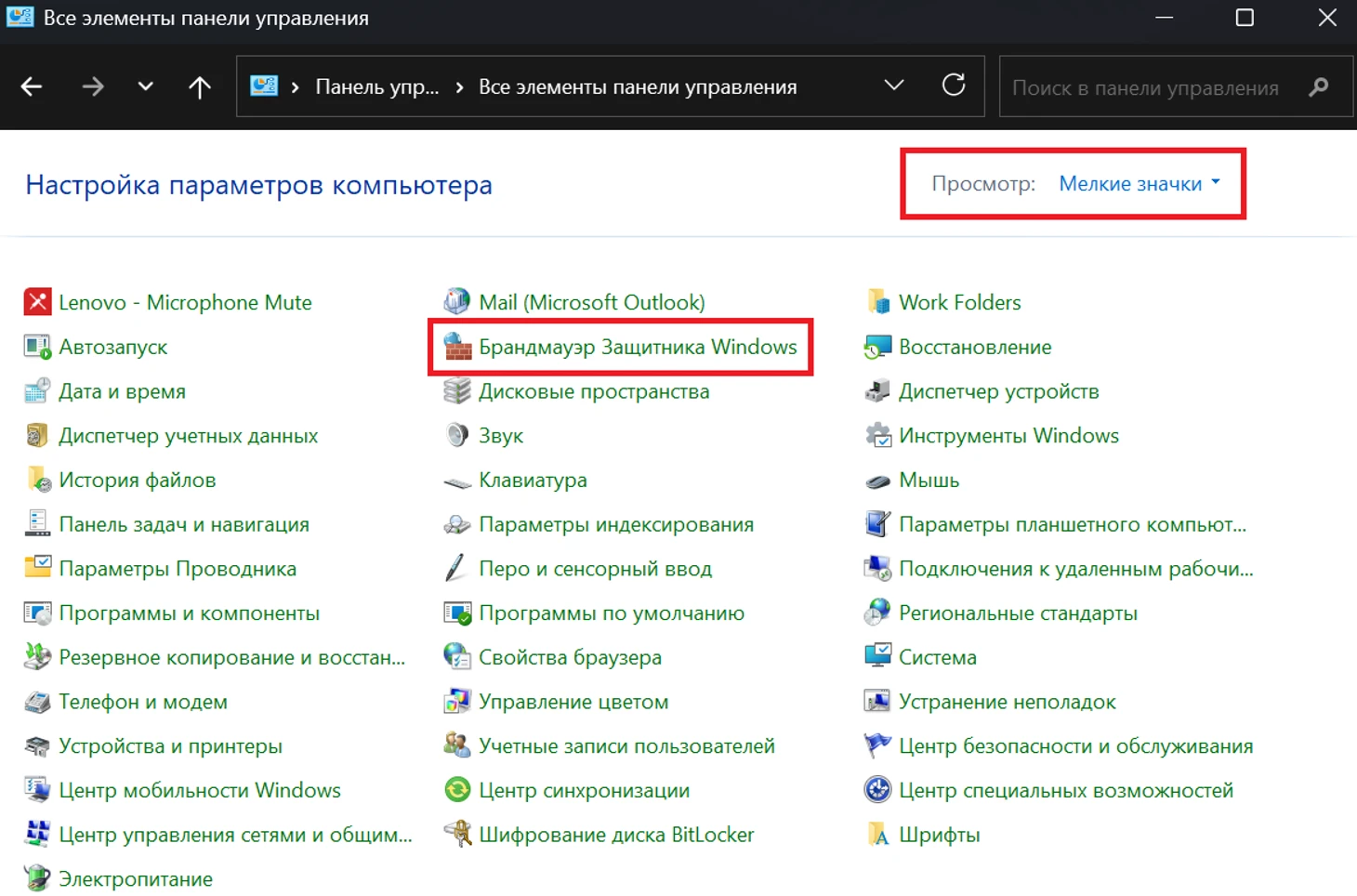 • В поиске или Пуске Windows введите «Панель управления» и откройте ее. Убедитесь, что в поле «Просмотр» установлен режим отображения «Крупные/Мелкие значки» вместо категорий по умолчанию.