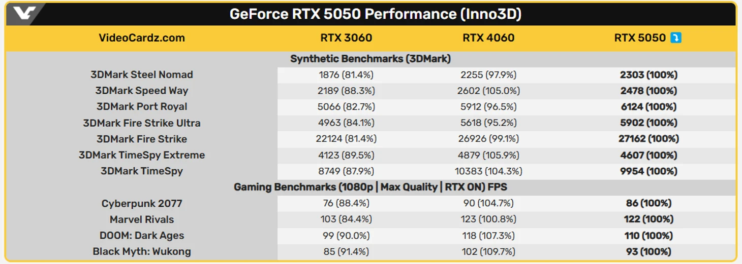 Компания Inno3D протестировала RTX 5050 в 4 актуальных играх при разрешении 1080p на максимальных настройках с включенной трассировкой и DLSS.