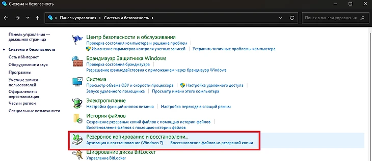 Перейдите в «Система и безопасность», «Резервное копирование и восстановление».