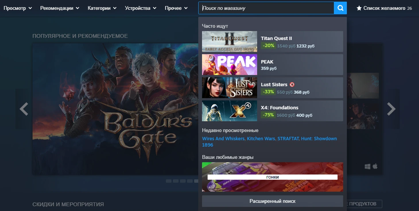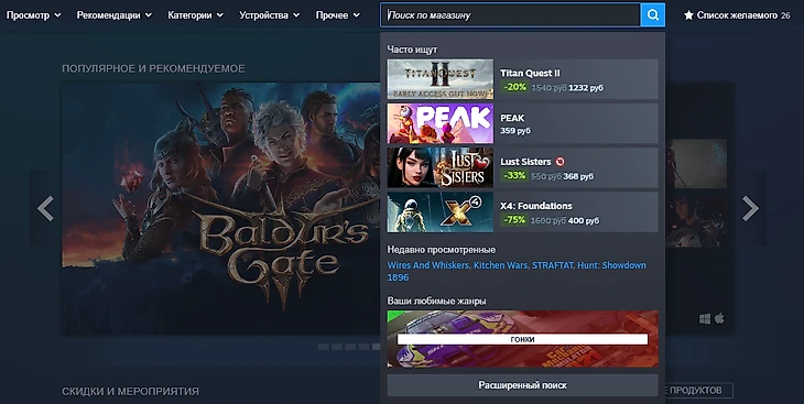 Поисковая строка стала лучше. Она ищет игры не только по названиям, но и по тегам. Дополнительно, она теперь показывает популярные запросы и историю поиска прямо при вводе.