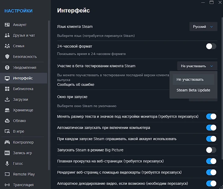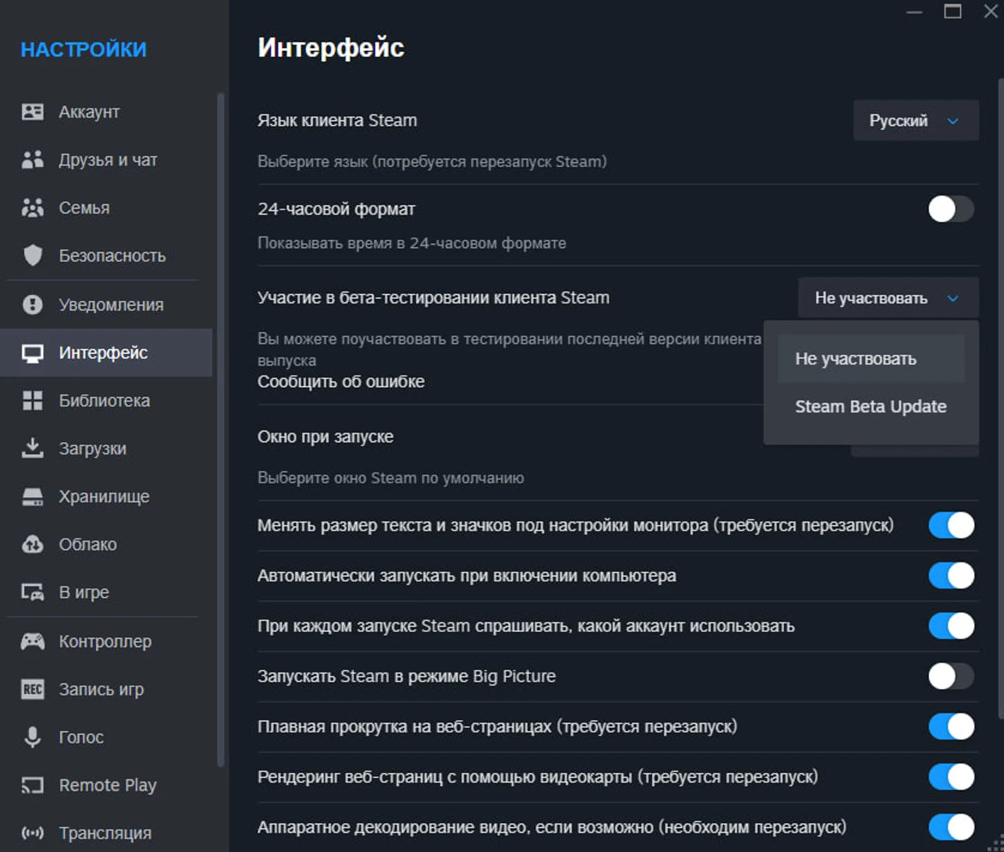Перейдите на вкладку Интерфейс. В разделе «Участие в бета-тестировании клиента Steam» нажмите на выпадающий список и выберите опцию Steam Beta Update.