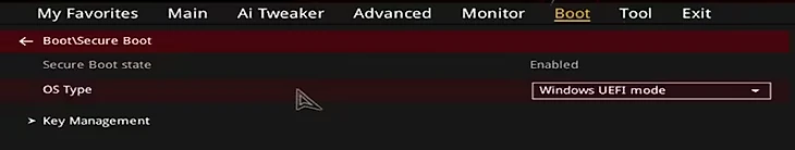 Итак, мы убедились, что BIOS настроен на режим загрузки UEFI, а системный диск в стиле GPT. Выходим на финишную прямую и включаем SecureBoot.