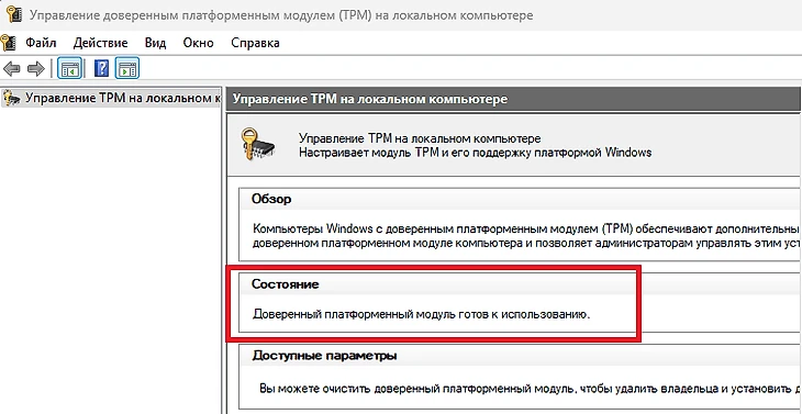 • Нас интересует пункт «Состояние», который отображает, готов ли TPM к использованию.