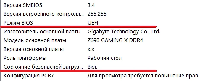 После загрузки Windows нажимаем комбинацию клавиш Win+R и пишем команду msinfo32. В появившемся окне «Сведения о системе» ищем строки «Режим BIOS» и «Состояние безопасной загрузки». Должно выглядеть так: