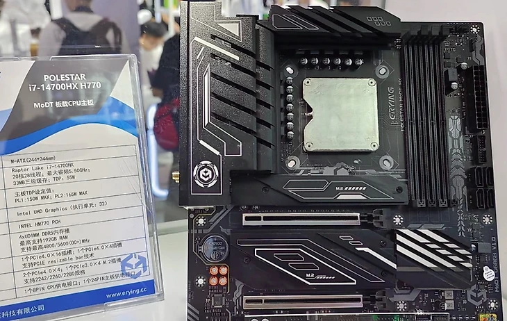Топовый мобильный i7-14700HX, распаянный на материнской плате. Плата включает 4 слота DDR5, M.2 и Wi-Fi. Вместо крышки – эффективная испарительная камера. И самое главное – сняты ноутбучные лимиты питания, поэтому чип может потреблять до 250 Вт!