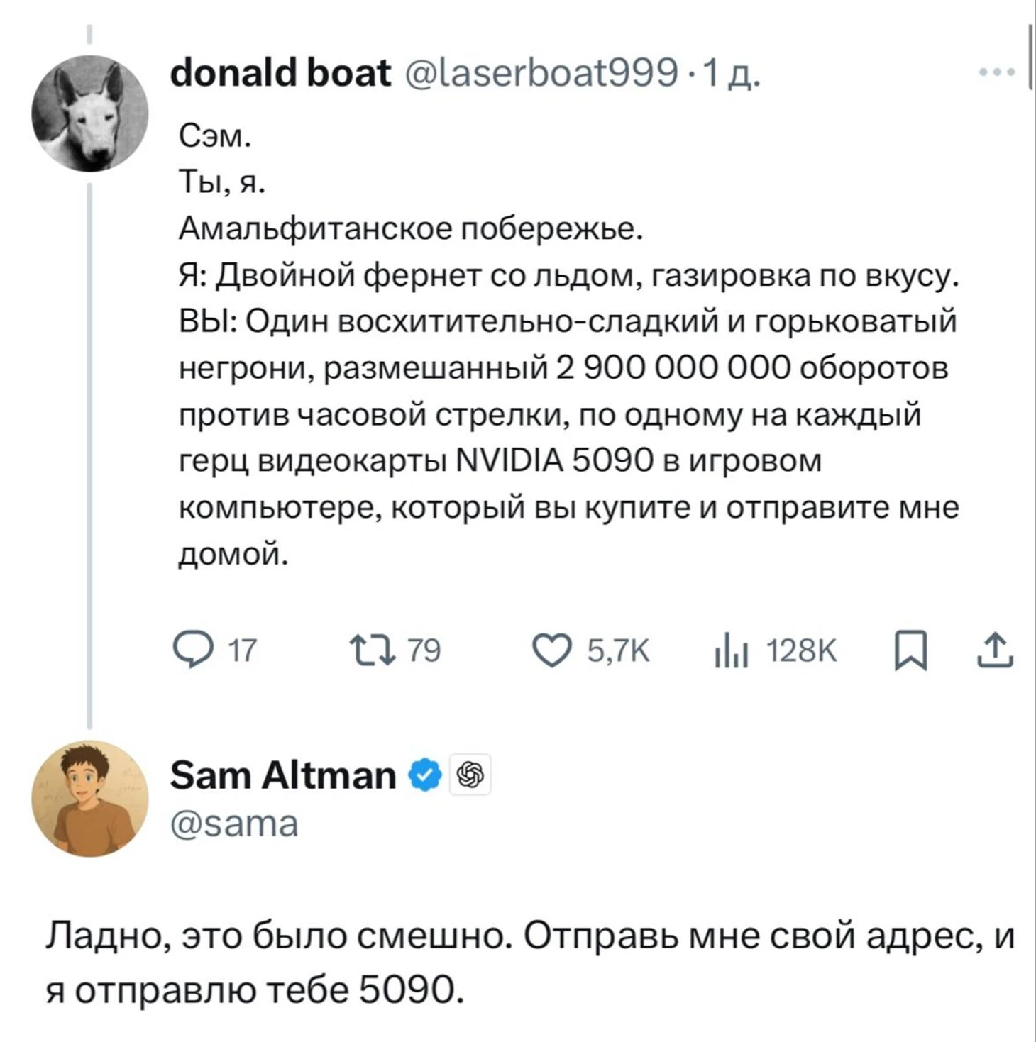 Пользователь X в шутку попросил Сэма Альтмана (основателя OpenAI) подарить ему RTX 5090. Альтман оценил гениальный подкат и попросил прислать адрес для отправки подарка.
