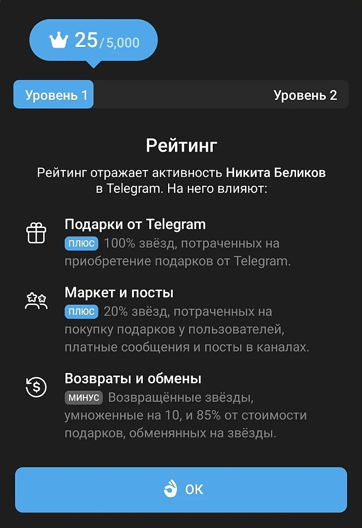 Также вам начисляют 20% от звезд, которые вы потратили на покупку подарков у других пользователей, отправку платных сообщений или на звездные реакции в каналах. Например, если вы поставили 100 звездных реакций под постами, то ваш рейтинг увеличится на +20 баллов.