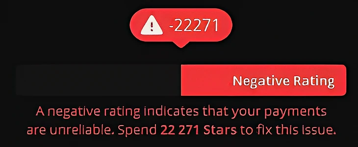 За возврат купленных звезд. При возврате потраченных средств вам спишут в 10 раз больше баллов, чем было куплено звезд. Пример: вы купили 100 звезд, а затем вернули за них деньги – потеряете 1000 баллов рейтинга.