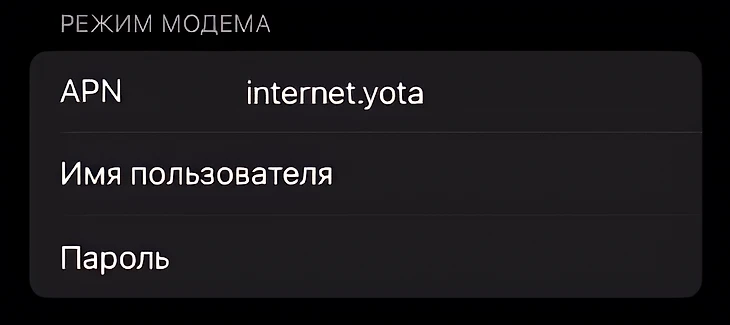 В открывшемся меню надо ввести данные конфигурации для функций, которые вам нужны. Если хотите просто пользоваться режимом модема, то пролистайте вниз и найдите пункт «Режим модема». Введите данные APN в это поле.