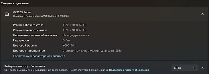 В строке «Выберите частоту обновления» выберите значение 60 Гц.