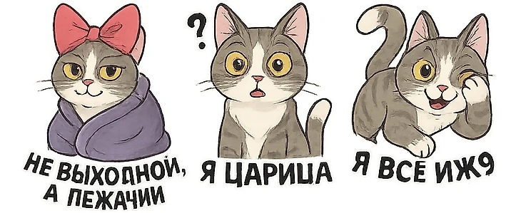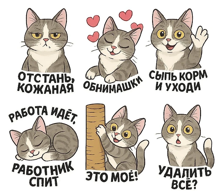«Ты – профессиональный дизайнер стикеров для мессенджеров (Telegram и WhatsApp) Создай уникальный стикерпак на основе фото моей кошки. Все стикеры должны быть узнаваемыми и передавать ее характер, но при этом оставаться стилизованными и удобными для использования в чатах.