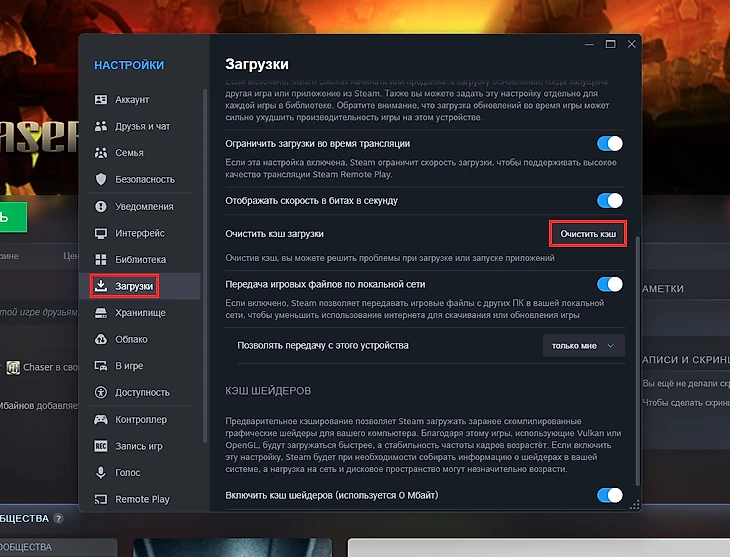Перейдите в раздел «Загрузки» и нажмите на кнопку «Очистить кэш загрузки».