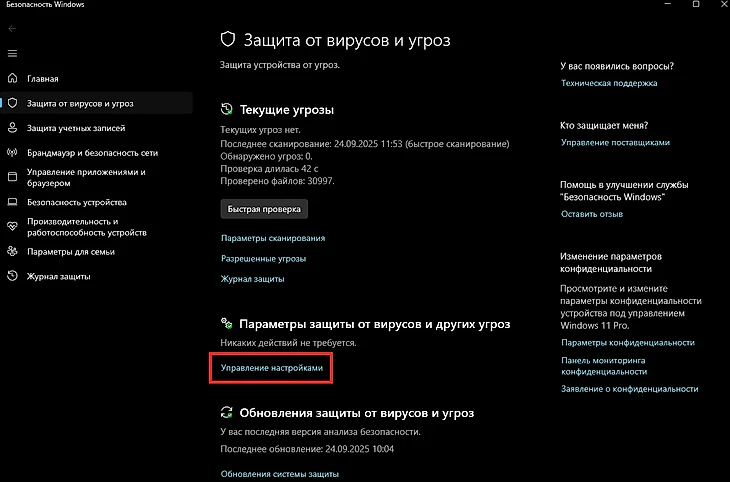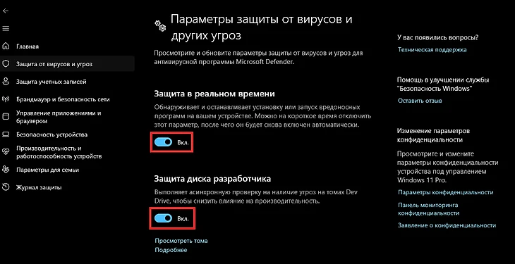 Временно отключите «Защиту в реальном времени» и «Защиту диска разработчика».