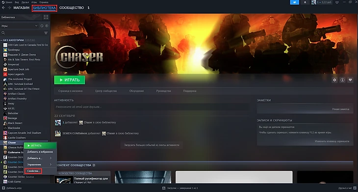 Запустите Steam, перейдите в «Библиотеку». Щелкните правой кнопкой мыши по проблемной игре и выберите «Свойства».