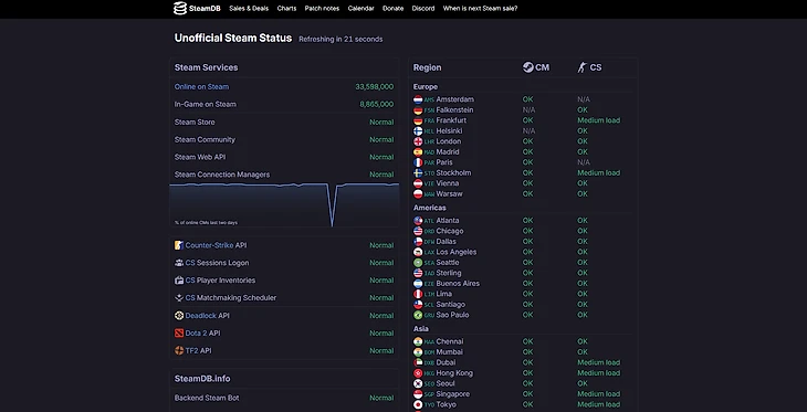 Если ни один из способов не помог, проверьте, не проводятся ли технические работы на стороне Valve. Для этого можно использовать сайты SteamStat.us или SteamDB. Если статус серверов отмечен как проблемы (сбои), остается только дождаться их устранения.