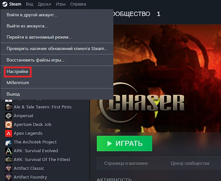 В Steam нажмите на меню «Steam» в левом верхнем углу и выберите «Настройки».
