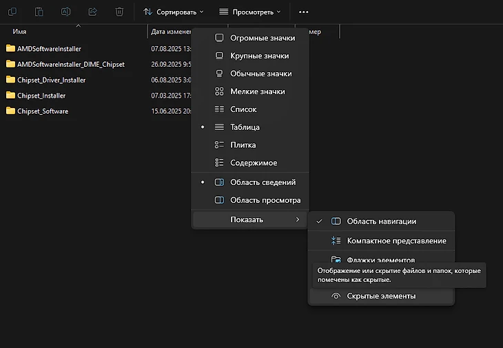 В раскрывшемся меню найдите раздел «Показать» и поставьте галочку напротив пункта «Скрытые элементы».