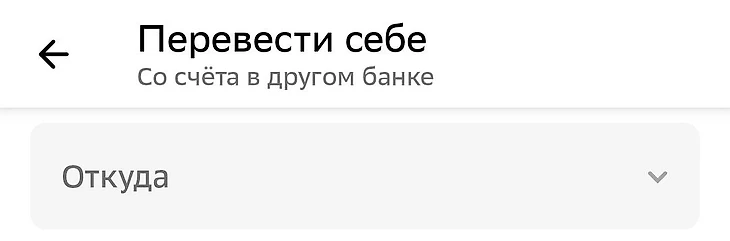 В разделе «Откуда» выберите вариант «С карты или счета другого банка».