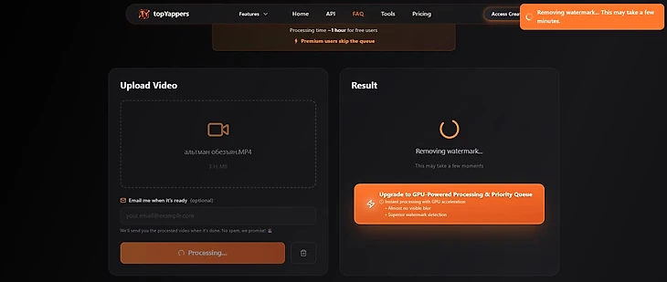Для этого удобнее всего использовать сервис topYappers, у которого есть специализированный инструмент, чтобы убирать водяные знаки. Все максимально просто: достаточно перейти по ссылке, загрузить необходимое видео и скачать уже готовый вариант.