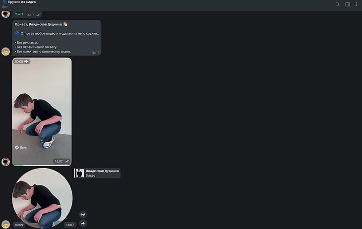 Дождитесь обработки, и бот вернет вам это же видео, но уже в формате кружка. Останется только переслать его в нужный чат.