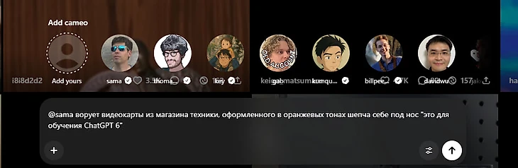 Или впишите тег конкретного аватара, который хотите добавить. Например, у Альтмана это @sama. После этого просто пишите промпт – простой или сложный, на них (и на все последующие функции) действуют все те же правила, – и создавайте видео.