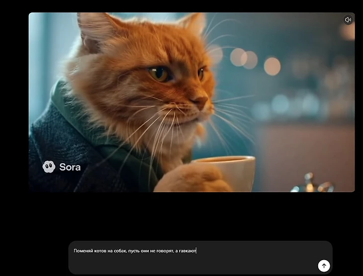 После этого впишите нужные изменения (например, «заменить котов на собак»), и нейросеть создаст новое видео на основе вашего исходного ролика.