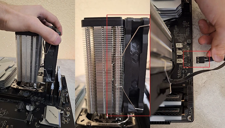 После необходимо закрепить вентилятор на радиатор (если он не был установлен заранее). Для этого закрепите металлические скобы, как показано на фото, и подключите его к питанию через разъем на материнской плате с пометкой CPU_FAN.