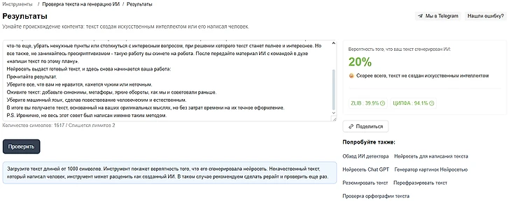 Подводя итоги, можно сделать несколько вывод, что наиболее надежный способ – использовать нейросеть как помощника для структуризации и оформления идей, с последующим редактированием и написанием значительной части работы вручную. Такой подход позволит обойти как системы проверки, так и не вызовет подозрений у читателей.