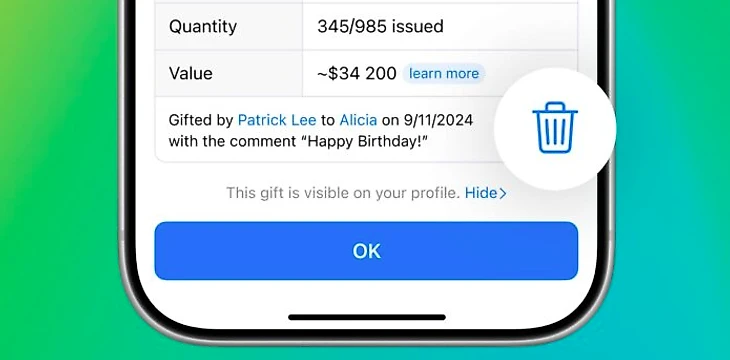 Технически, подпись не стирается с существующего предмета. Telegram присылает вам точно такой же новый подарок, но уже без подписи. Из-за этого обновленный подарок получает торговое ограничение (трейд-бан) на 21 день, в течение которого его нельзя будет передарить, продать или обменять.